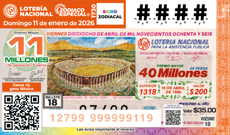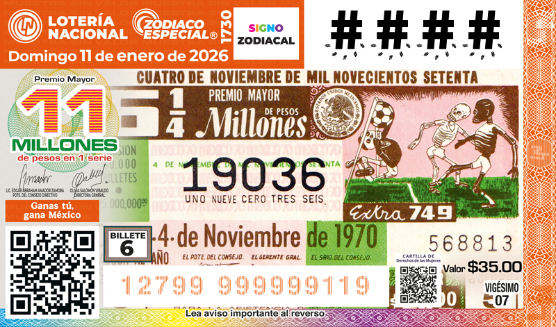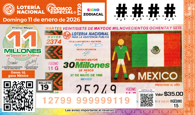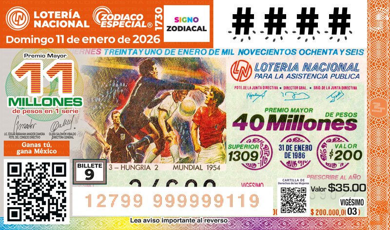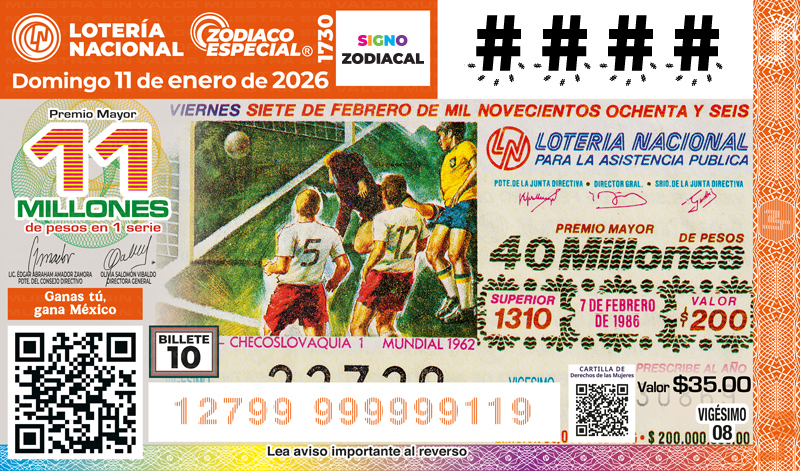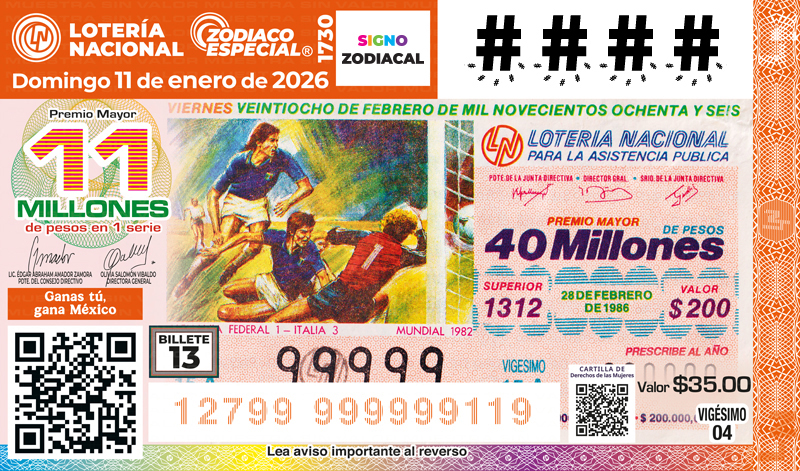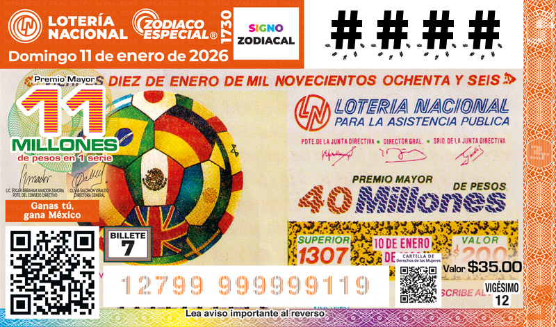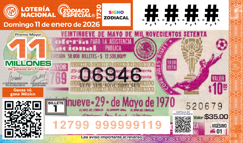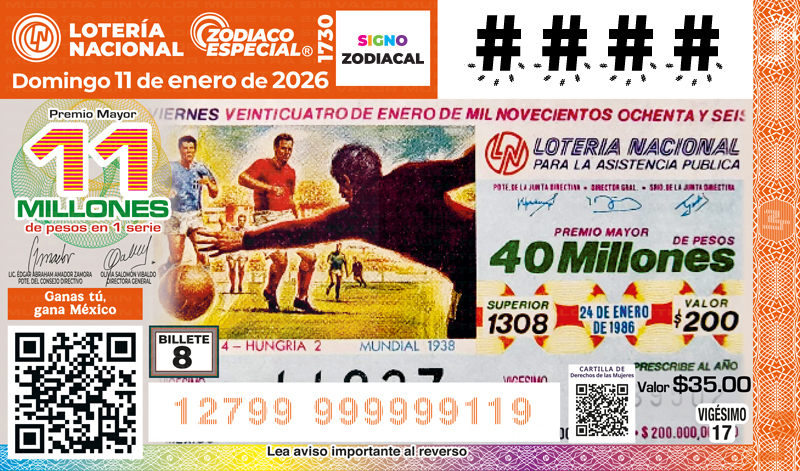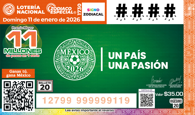 En el contexto del máximo evento futbolístico internacional, la Lotería Nacional realiza el Sorteo Zodiaco Especial No. 1730 como un homenaje a la historia, la identidad y la memoria colectiva del fútbol en México. Esta emisión conmemorativa recupera los momentos que han marcado al país como sede mundialista y jugadas icónicas en la historia de los mundiales, así como la reivindicación histórica del Mundial Femenil de 1971, reconociendo a sus protagonistas como parte fundamental del legado deportivo nacional. Mediante una emisión conmemorativa de 20 billetes, la institución rinde homenaje a los mundiales de 1970 y 1986, así como al Mundial Femenil de 1971, reconociéndolas como subcampeonas y protagonistas pioneras. Esta colección permite al público adquirir nuevamente billetes conmemorativos de épocas pasadas, incluso aquellos que no pudieron obtener en su momento, convirtiendo cada cachito en un objeto de memoria compartida. Como parte de esta iniciativa, la institución presenta el Álbum Retro Lotería Nacional y el Fútbol, concebido como un puente entre generaciones. El álbum recupera la tradición gráfica de la Lotería Nacional y la entrelaza con la historia del balompié, invitando a revivir emociones, recordar gestas deportivas y compartir relatos que han dado forma a la identidad futbolera del país. Su entrega gratuita a quienes adquieran las series completas del sorteo refuerza el carácter social y cultural de esta propuesta. Este sorteo que se realiza con especial entusiasmo, se inscribe en el camino rumbo a México 2026, y culmina con el billete “Un país, una pasión”, como símbolo de unión, orgullo e identidad nacional.