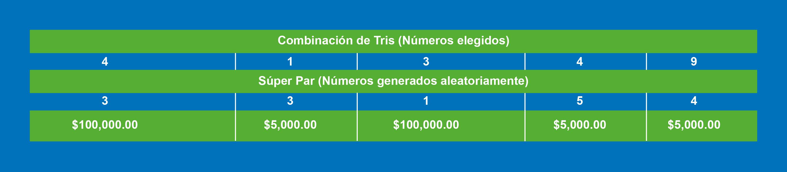 Si los números generados por Súper Par coinciden en la misma columna con alguno de tus números de Tris, ganarás la cantidad indicada en tu boleto (determinada aleatoriamente por el sistema de Súper Par).