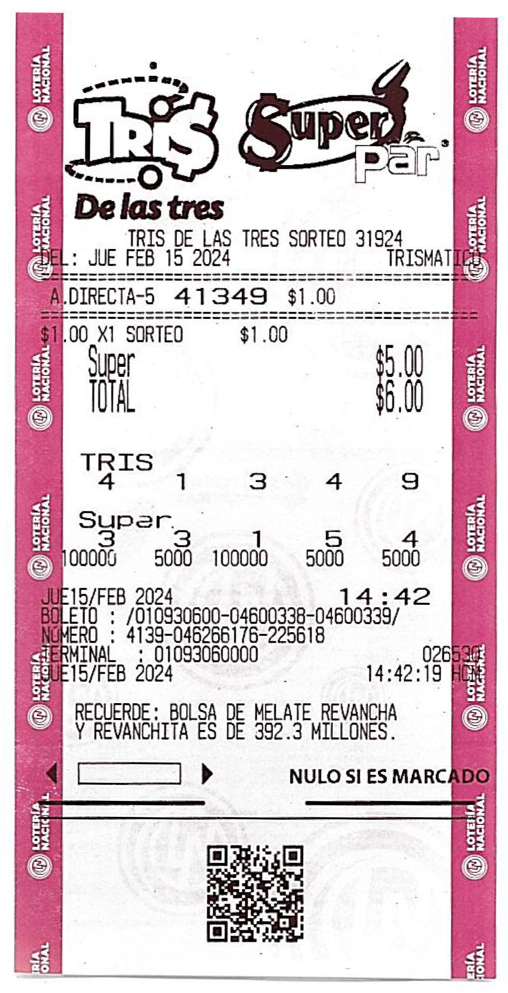 Ejemplo de boleto Tris + Super Par: